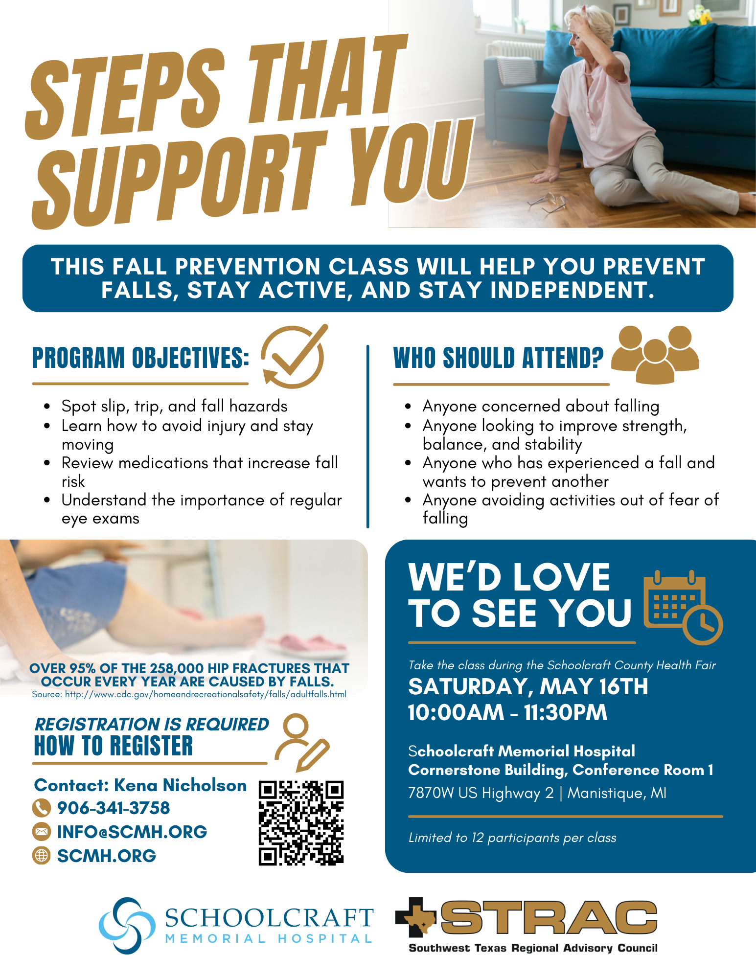 Join us for a Fall Prevention Class during the Schoolcraft County Health Fair and learn how to stay safe, active, and independent.