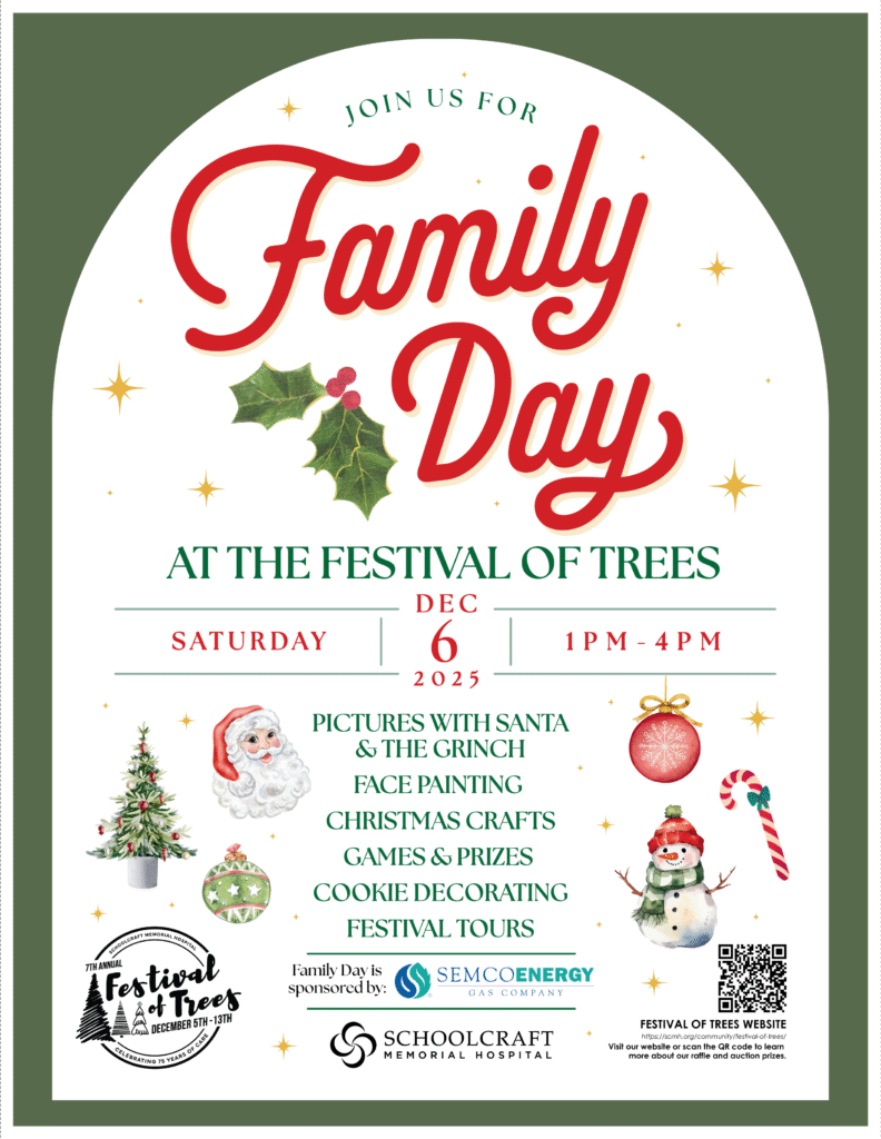We are excited to invite you to participate in this year’s 7th Annual Festival of Trees, happening from December 5–13 in the beautiful Schoolcraft Memorial Hospital Atrium. Year after year, the local business creativity and generosity have brought this holiday tradition to life, turning it into a cherished community event.