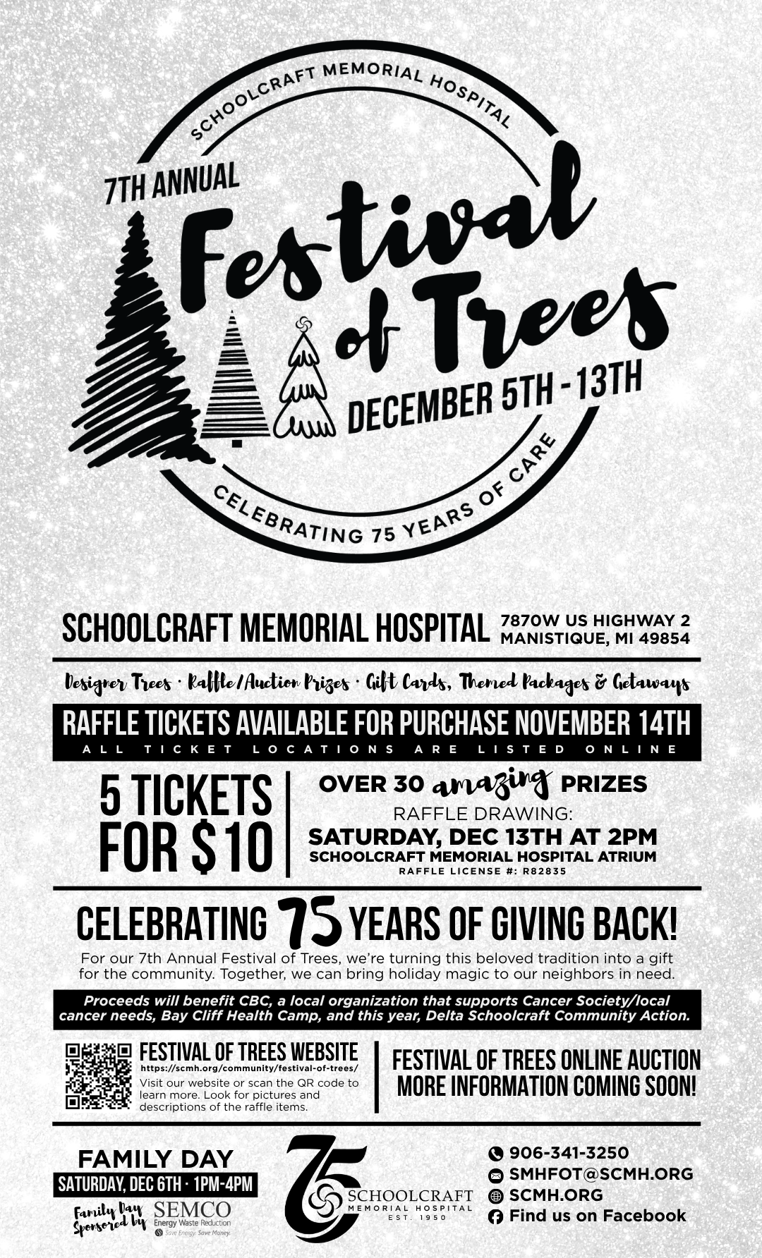 This year marks a significant milestone for Schoolcraft Memorial Hospital: 75 years of serving our communities with compassion, innovation, and dedication. To honor this anniversary, we are celebrating in a big way by giving back. Proceeds from the 2025 Festival of Trees will benefit CBC (Cancer, Bay Cliff, Community Action), a nonprofit organization that directly supports the Cancer Society & local cancer patients, Bay Cliff Health Camp, and this year’s community charity, Delta Schoolcraft Community Action.